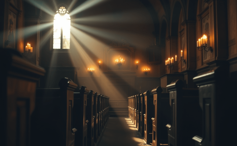 Candles flicker old pews creak.